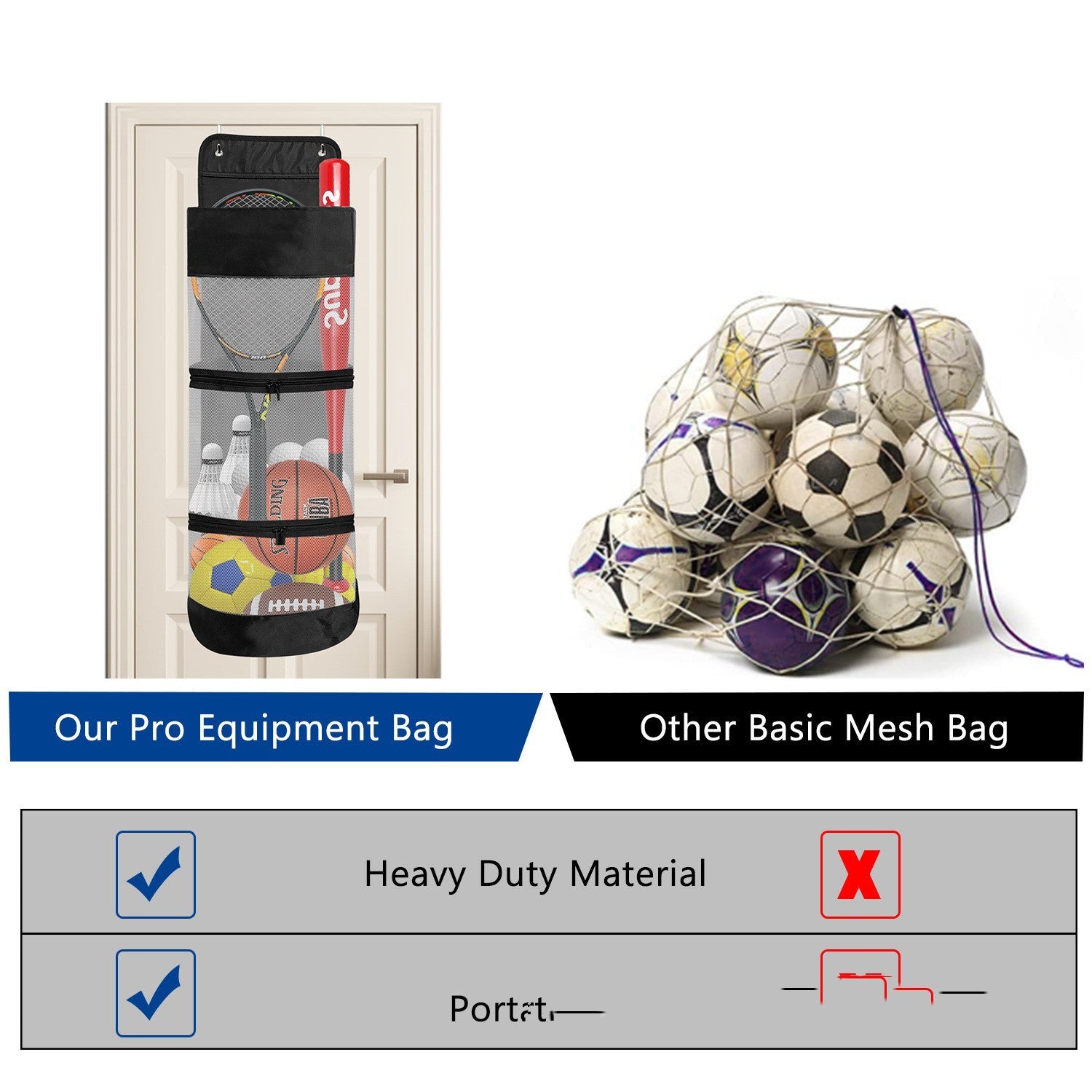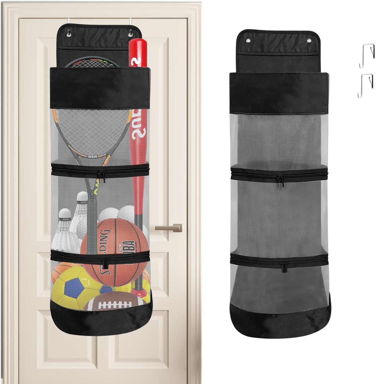 Använd den för att samla upp fotbollar, basketbollar, volleybollar eller racketsporttillbehör som pingisbollar och badmintonracketar. Det slitstarka nätmaterialet gör att utrustningen håller sig ventilerad och synlig.
