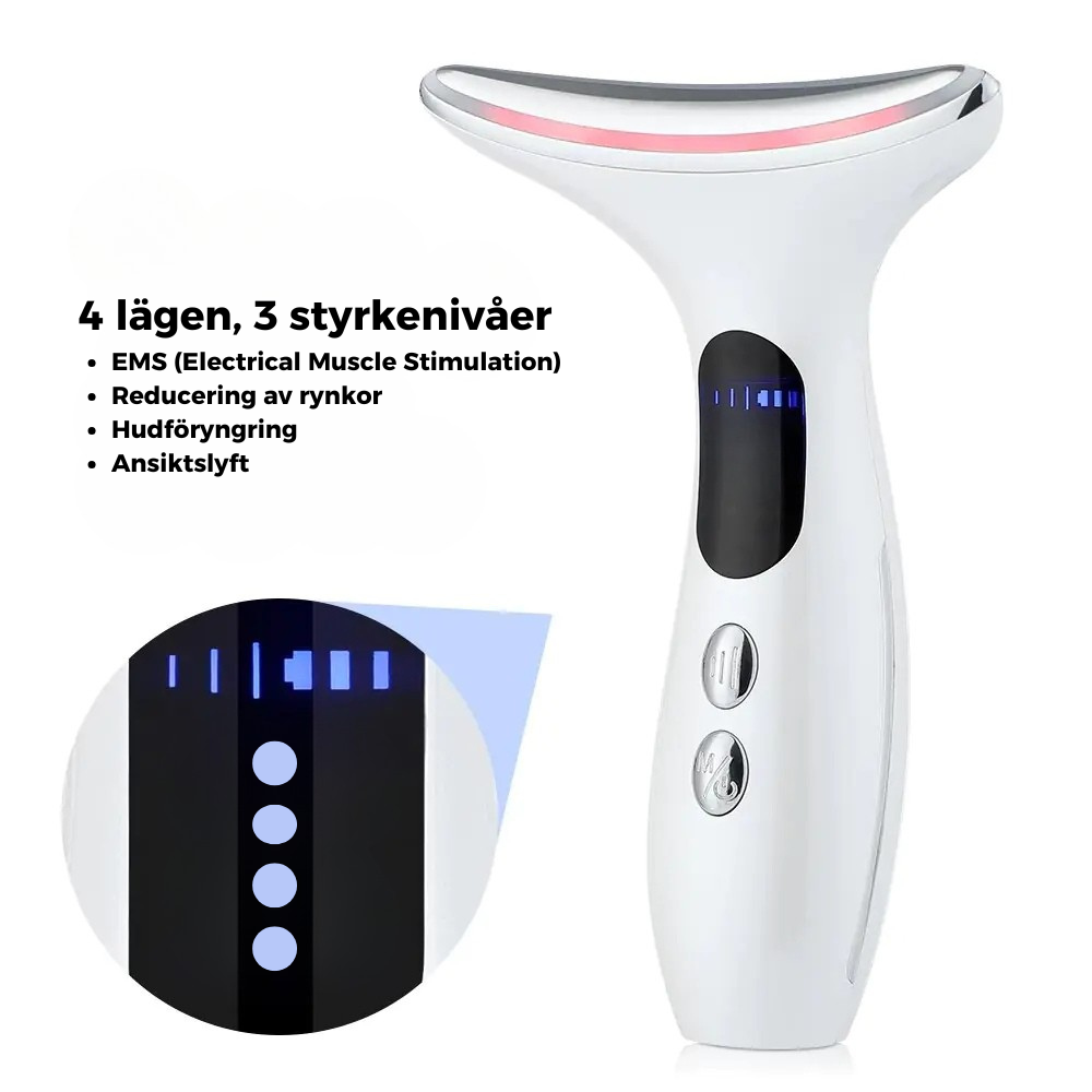 Njut av fördelarna med behandlingar av professionell kvalitet hemma. Du tonar och lyfter enkelt ditt ansikte och din hals, vilket ger ett uppfräschat utseende. Fina linjer och rynkor slätas ut och huden får en ungdomlig och strålande fräschör.