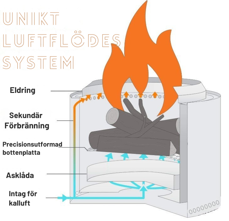 Med upp till 360 minuters brinntid levererar detta smarta sprit-/vedkök stabil och effektiv värme för hela måltiden – idealiskt för 3–5 personer. Eldringen i metall gör att det blir ett säkert eldstadsområde. Den inbyggda eldringen hjälper till att rikta lågorna och optimerar en sekundär förbränning genom att cirkulera varm luft och gaser, samt skapar ett jämnare och hetare eldutrymme. Den sekundära förbränningen ger en rökfri, hetare eld.